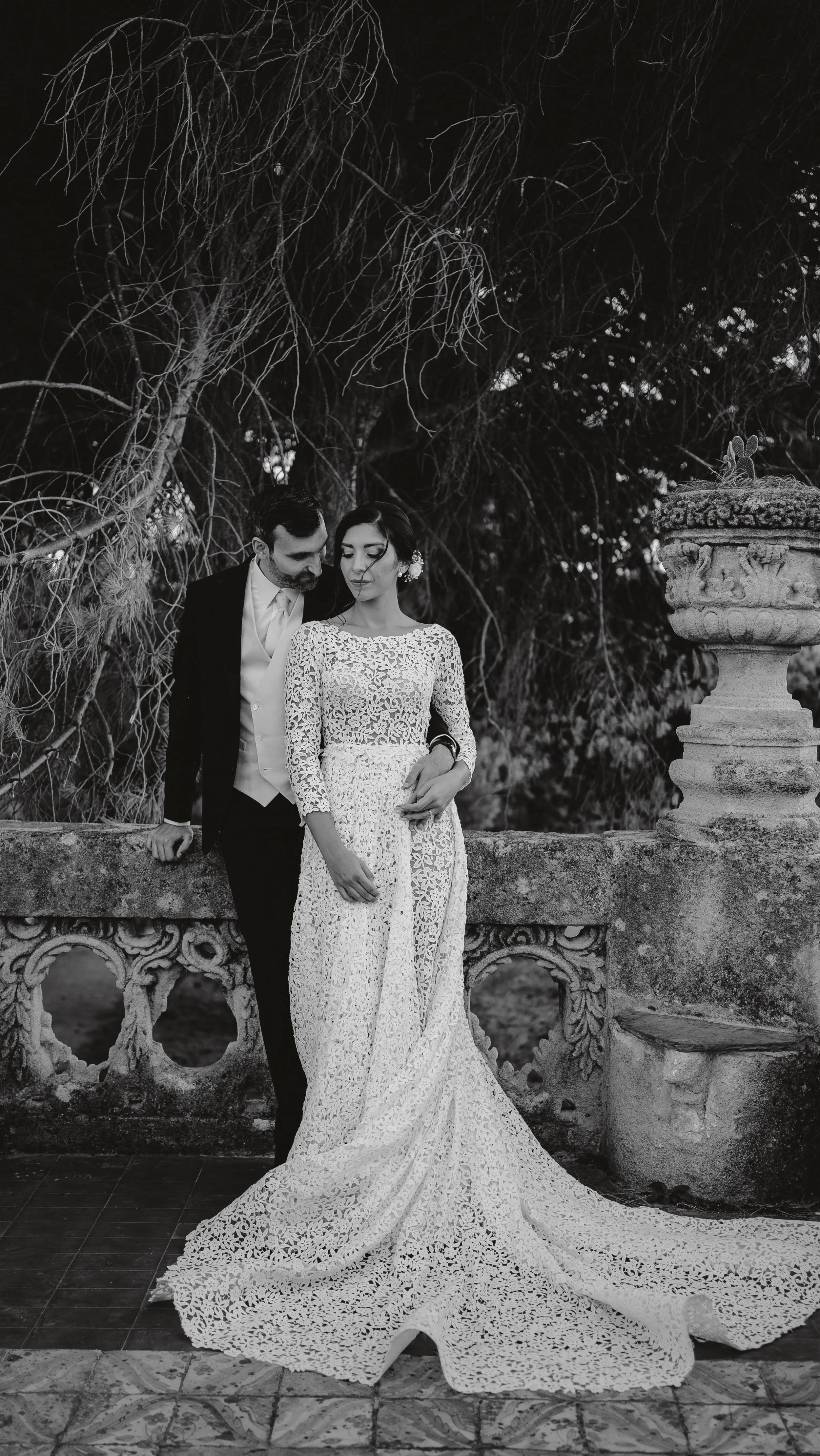 A black and white photo of a bride and groom kissing outdoors, with blurred background and rocky foreground.
